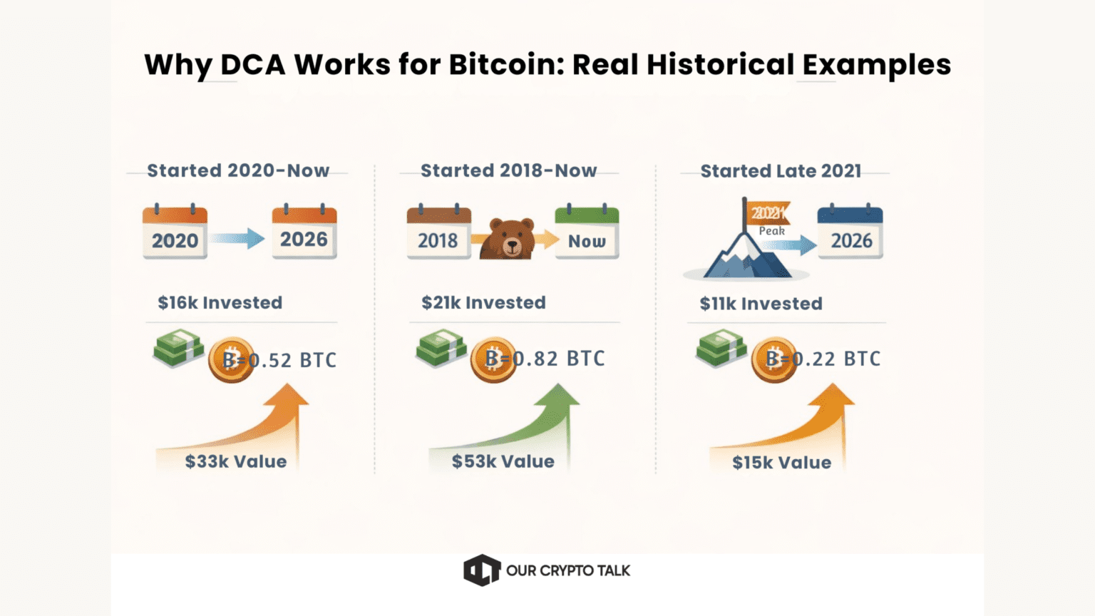 Historical Bitcoin DCA scenarios showing how consistent buying performed across very different entry points