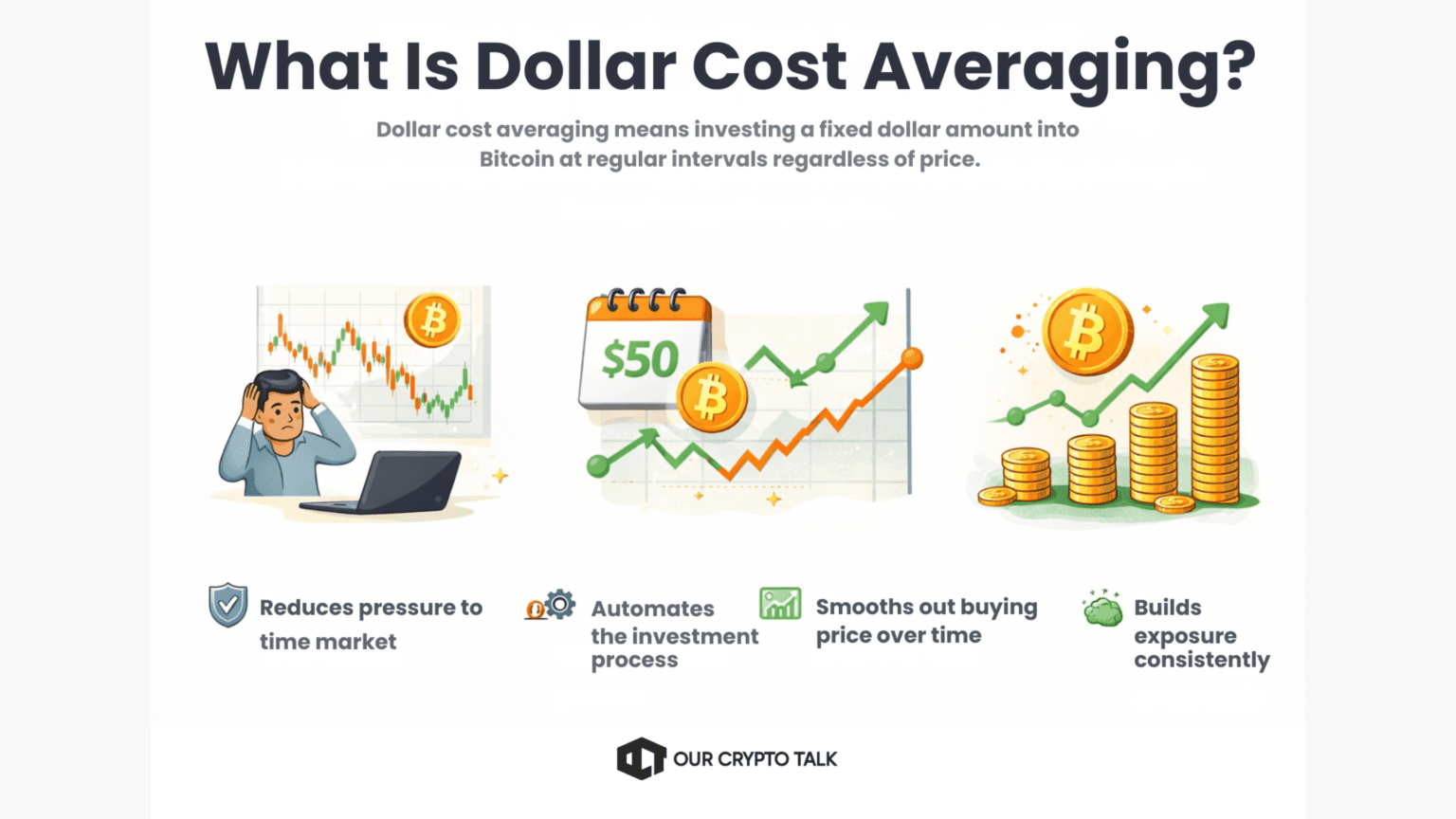 A bitcoin dollar cost averaging strategy exists to solve exactly this fear. It is not a trading system. It is not a complex financial framework. Instead, it is a simple process that removes timing pressure and replaces it with routine.