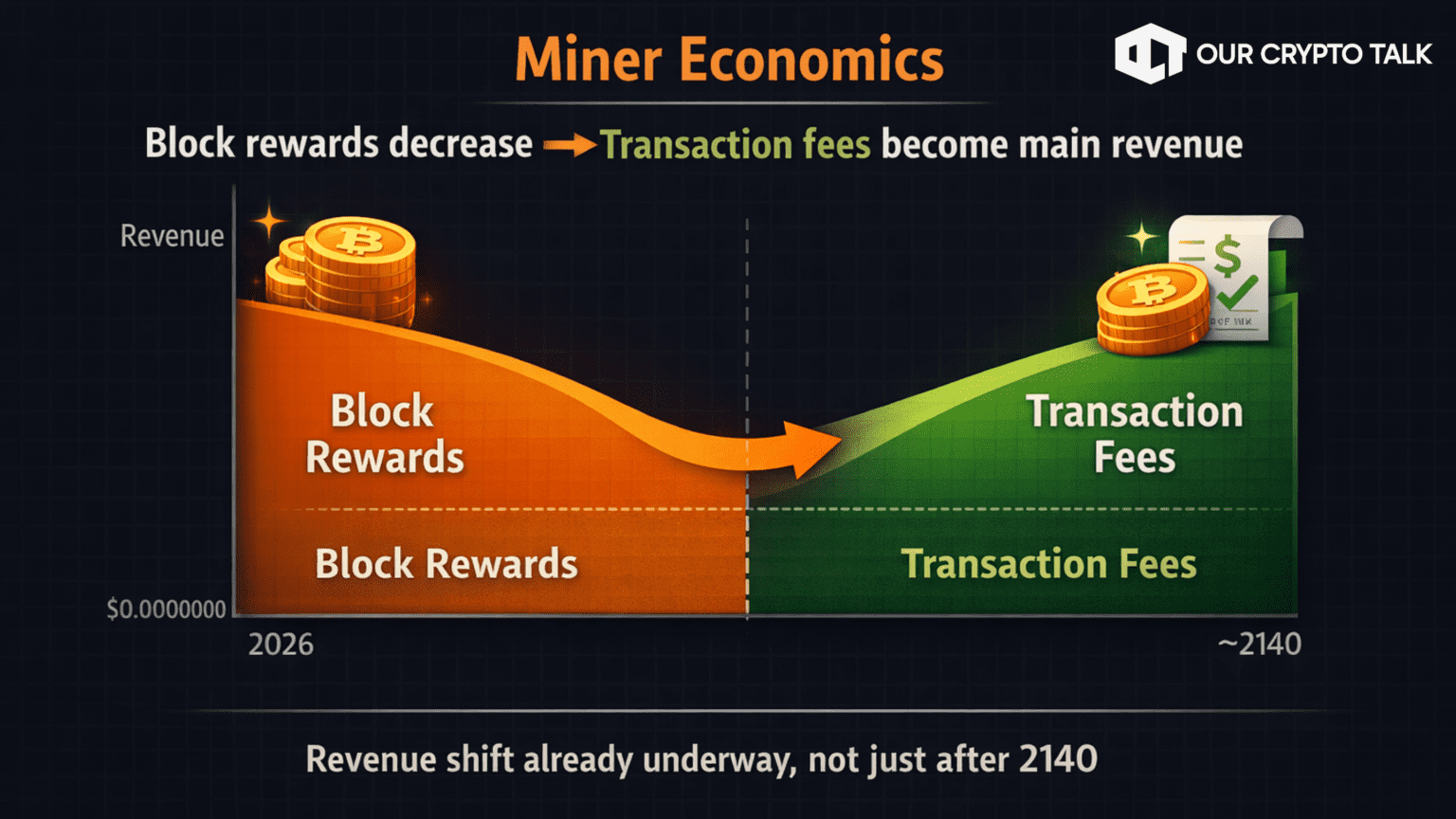 As each halving reduces the block reward, miners receive fewer new coins for securing the network. Over time, this forces a transition toward a system where transaction fees play a much larger role in sustaining mining operations. This shift is not something that begins in 2140 when the last Bitcoin is mined. It is already happening gradually with each halving cycle.