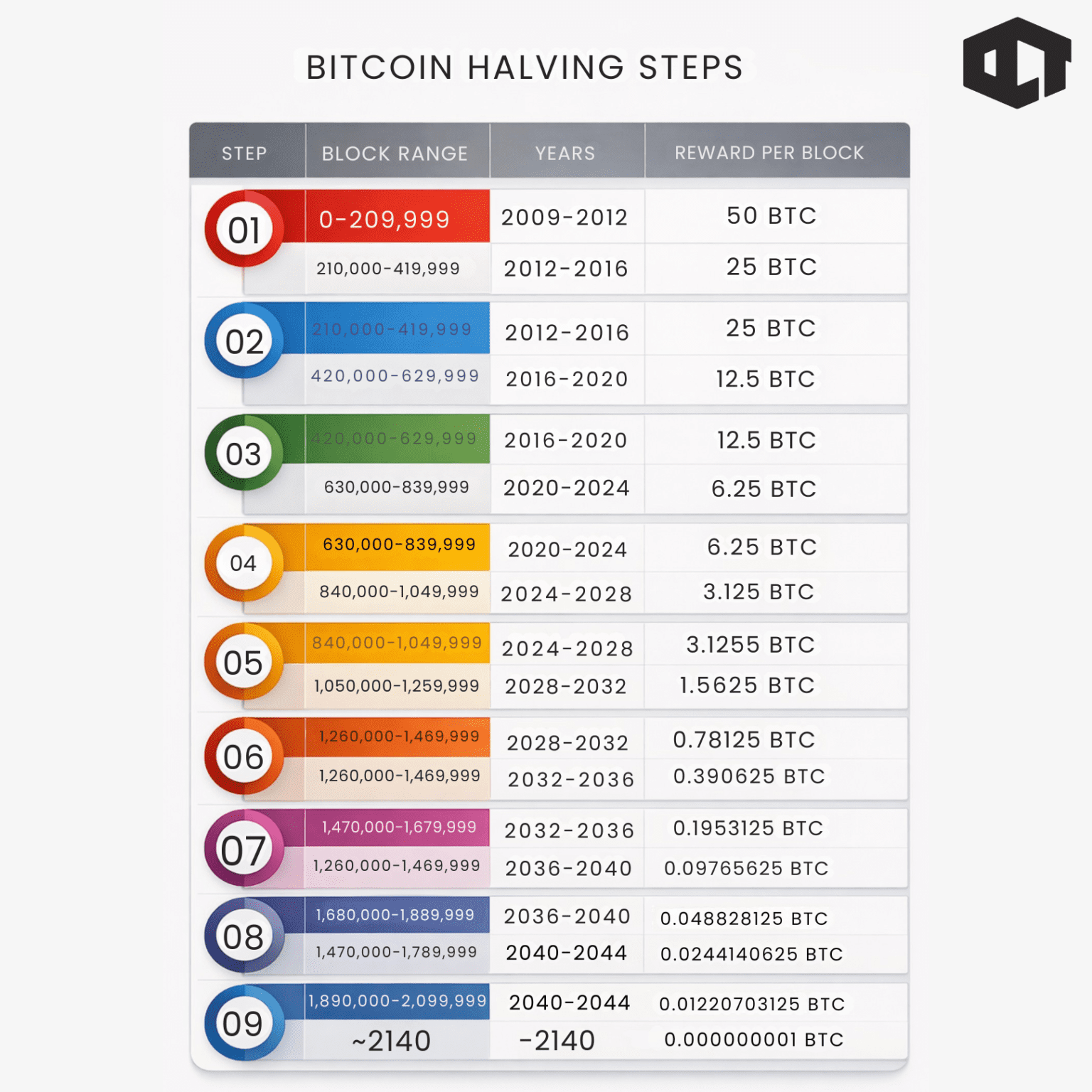 In practice, Bitcoin cannot divide infinitely. The smallest unit is 1 satoshi (0.00000001 BTC). Because of this rounding, the actual total is: 20,999,999.9769 BTC