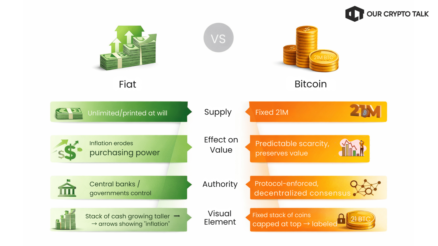 Bitcoin operates differently from traditional money. It enforces a fixed supply, making scarcity the core feature rather than a side effect. No authority can create more coins at will.