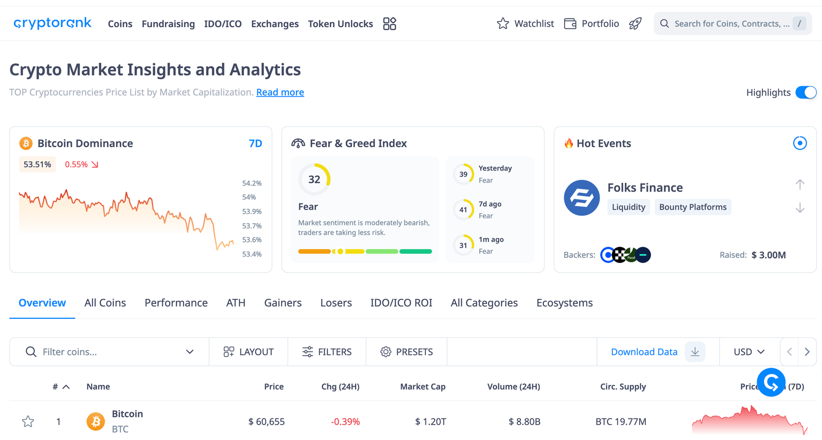 Overview and Key Features: CryptoRank provides a broad overview of the crypto market, including price tracking, historical data, and rankings of crypto projects. Its comprehensive metrics cover market capitalization, trading volumes, and social sentiment.