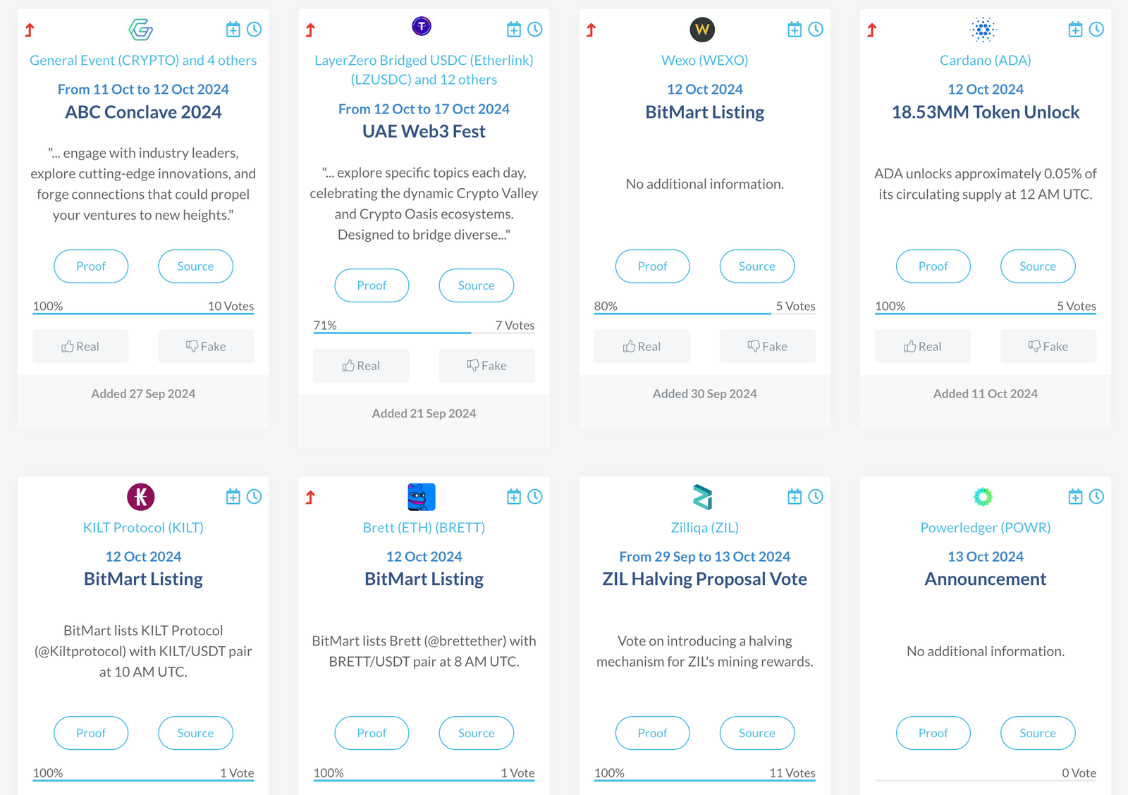 Overview and Key Features: CoinmarketCal is a popular events calendar for cryptocurrency projects. It provides a schedule of upcoming events, updates, and announcements for various crypto projects, all with a potential impact on prices and market sentiment.