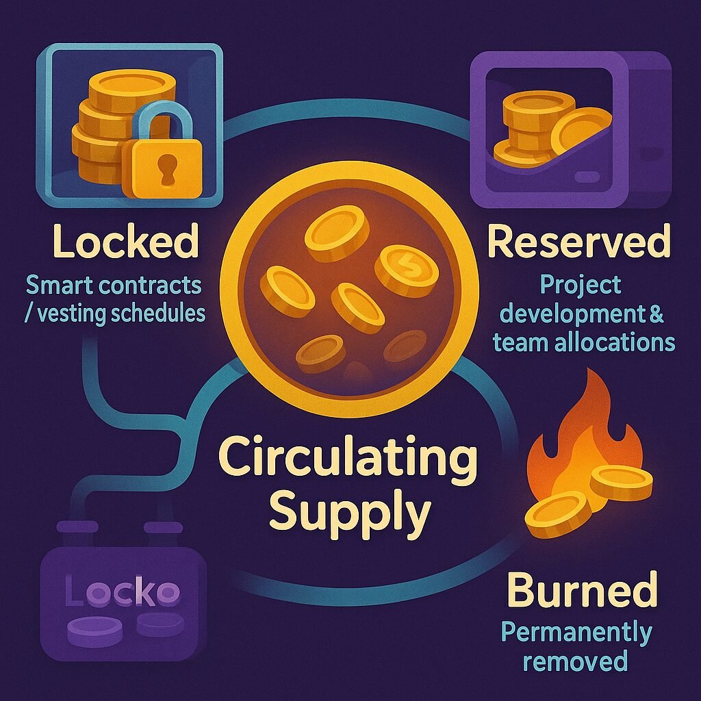 Locked Tokens: Coins held in vesting schedules or smart contracts, not tradable yet.