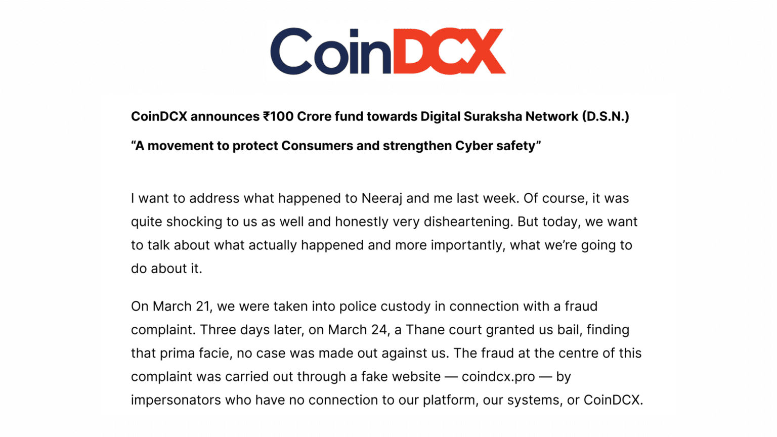 Most companies would have gone quiet after an ordeal like this. CoinDCX, however, did the opposite. Just six days after their release, on 30 March, one of Coin DCX founders CEO Sumit Gupta broke his silence in a virtual press briefing. He announced the Digital Suraksha Network (D.S.N.). CoinDCX committed ₹100 crore (roughly $11-12 million) to fund the initiative over the next three to five years.