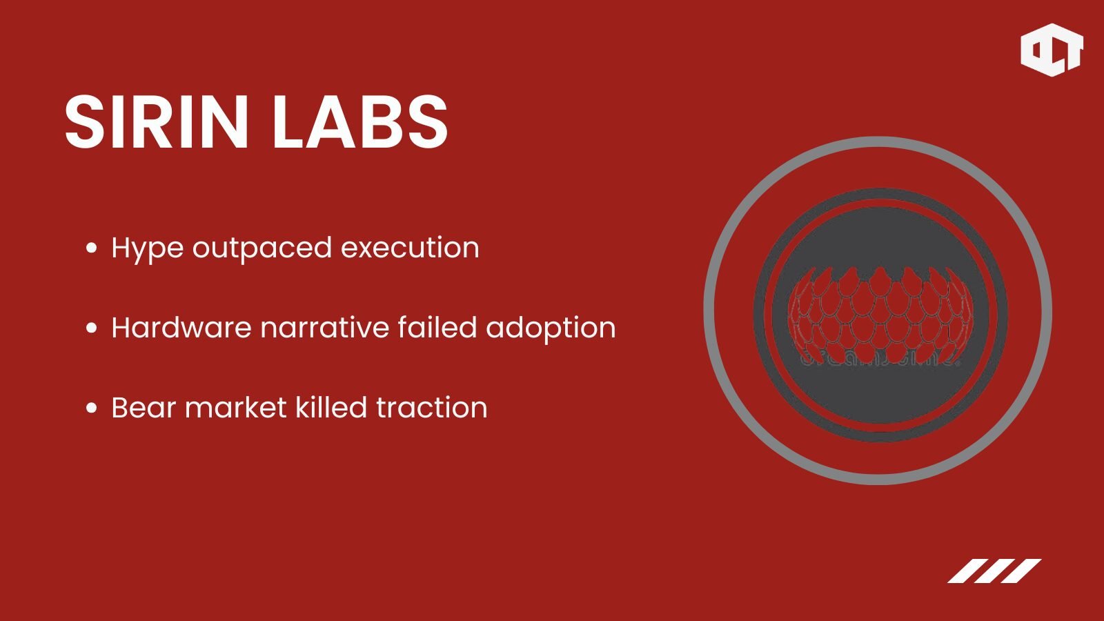 As liquidity dried up during the bear market, SRN lost more than 99 percent of its value and faced delistings. With no viable product traction, the project faded from relevance. Sirin Labs became a textbook case of ambitious hardware narratives failing in crypto downturns.