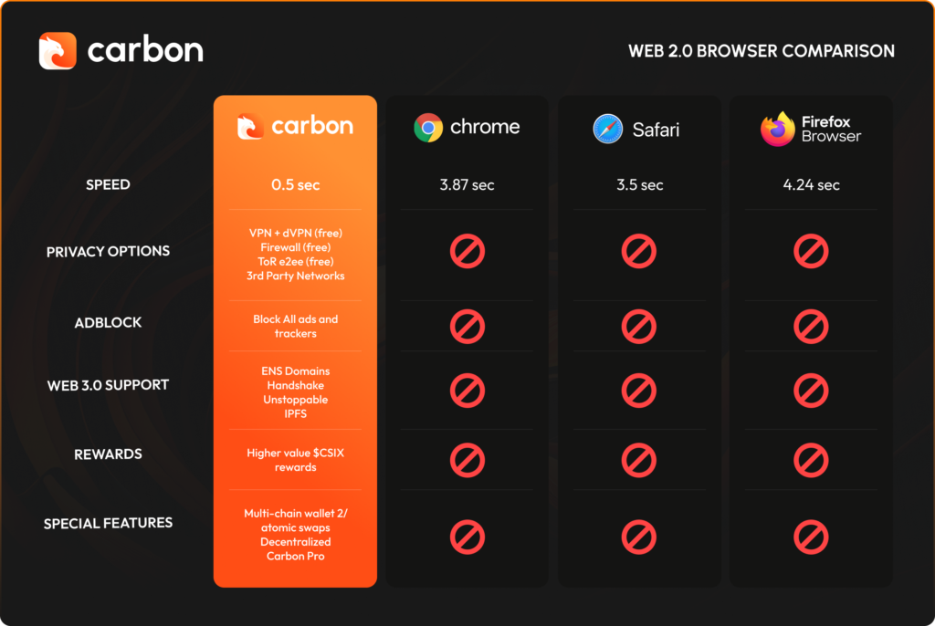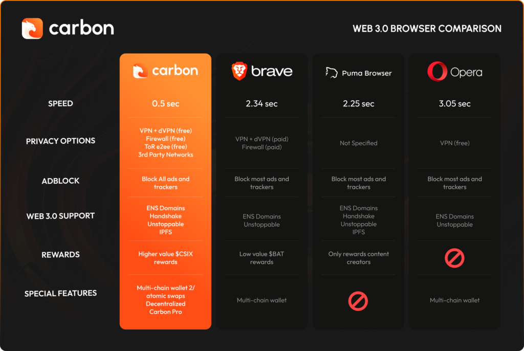 Carbon solves all these issues and provides a further layer of web 3.0 features with ENS domains, IPFS , multi chain wallets and browse to earn.