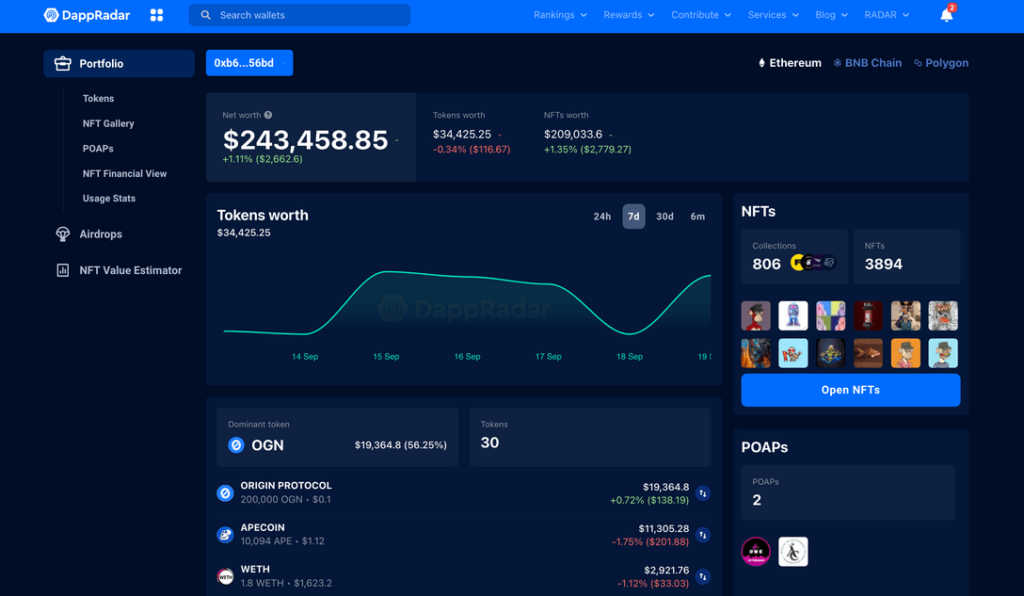 Importantly, DappRadar did not stop at showing metrics. It also introduced interactive tools that helped engage a growing global audience. In 2021, it launched a Portfolio Tracker. This allowed users to connect their wallets and monitor token and NFT holdings across various chains in one dashboard.