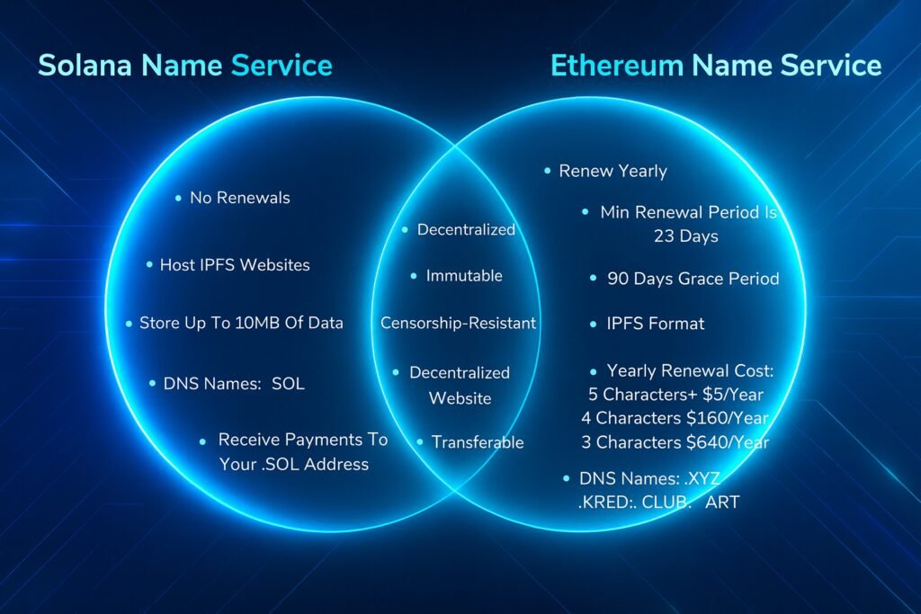 Compare ENS vs SNS, Ethereum and Solana’s name services. Explore history, features, adoption, pros and cons, and future trends.