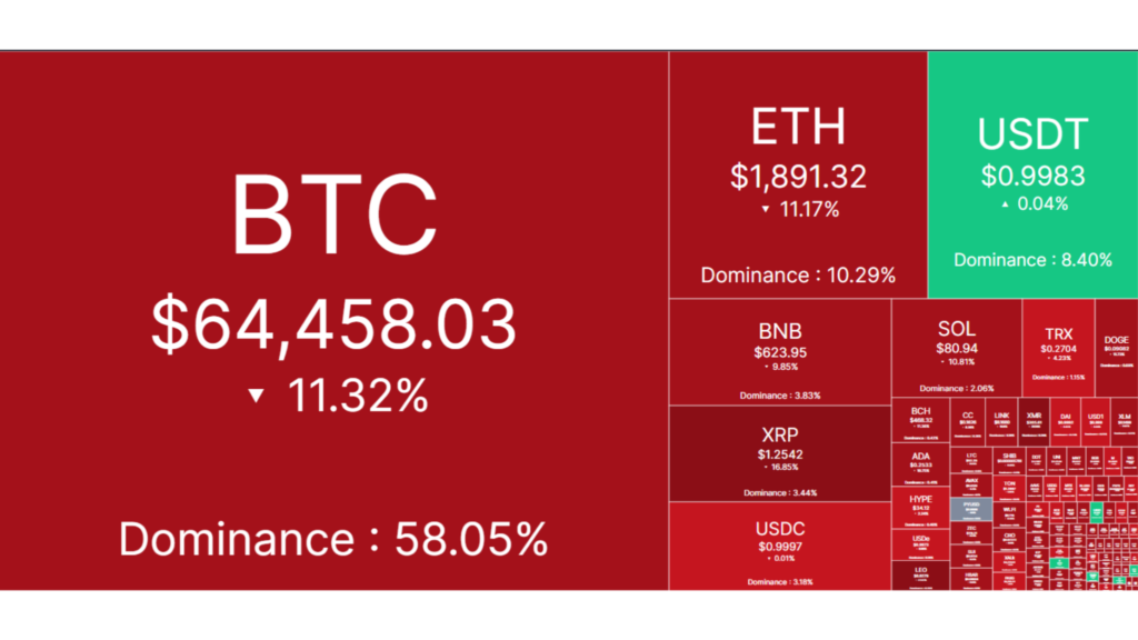 Bitcoin lost the $70,000 support level decisively and briefly traded near $62,500 before stabilizing. Ethereum reached its lowest level since mid-2025. Solana tested the $90 range. XRP declined more than 20 percent in a single session. Binance’s BNB fell over 13 percent, reflecting pressure across centralized and decentralized venues.
