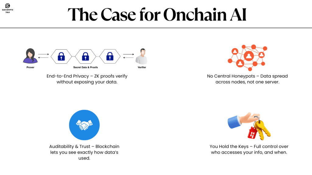 This is where decentralization comes in. Onchain AI flips the model completely.