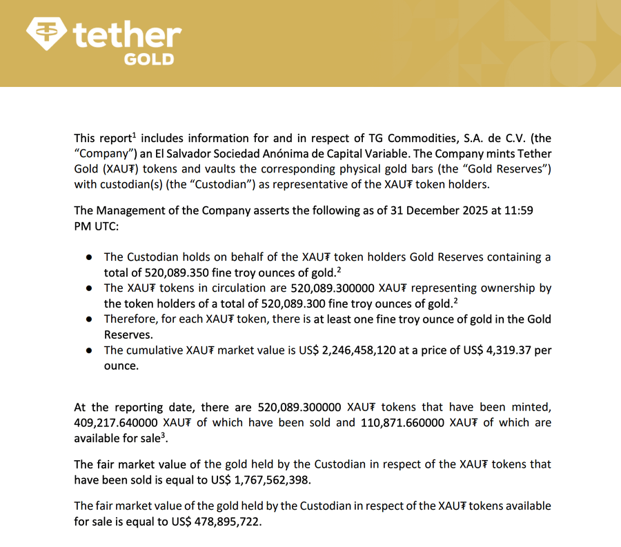 Well, @tether has increased its gold holdings to 140 tons, primarily to back XAUt… In the Q4 2025, they added 27 metric tons to its reserves (you can check the report at gold.tether.to/reports).