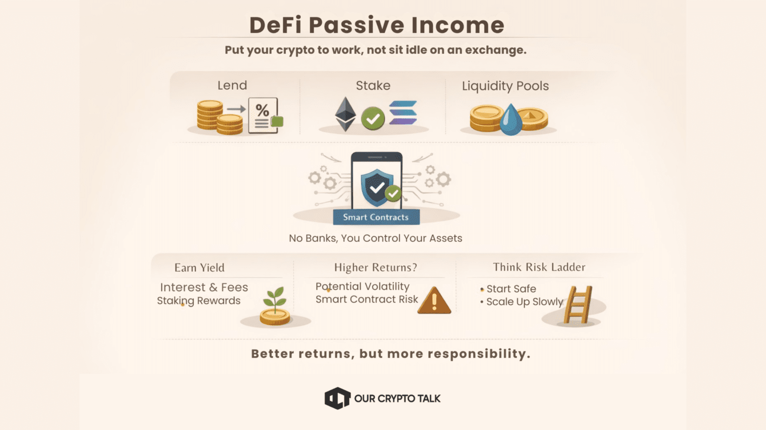The simplest way to think about DeFi passive income 2026 is this: instead of letting your crypto sit idle on an exchange, you put it to work inside decentralised protocols that generate yield. If you already hold crypto on an exchange and want to do more with it, DeFi gives you a way to put those assets to work. Instead of leaving coins idle, you can lend them, stake them, or use them in liquidity pools to earn yield. Smart contracts handle the process instead of a bank.