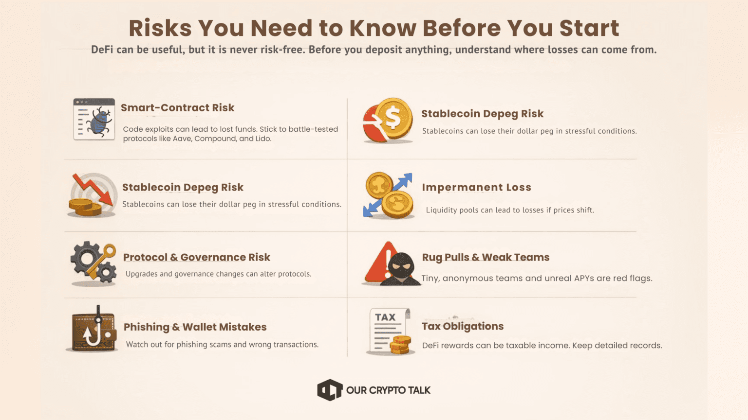 DeFi can be useful, but it is never risk-free. Before you deposit anything, understand where losses can come from.