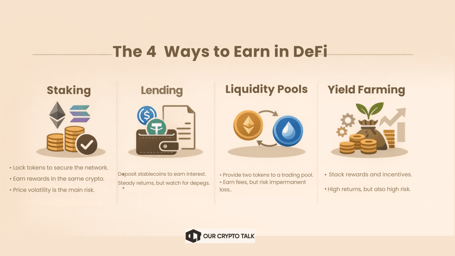 Lending is the easiest place for most beginners to start. You deposit assets into a lending protocol, and borrowers pay interest to access those funds. Stablecoin lending is especially popular because your balance stays in a dollar-pegged asset like USDC or USDT. The main risks are smart-contract risk and stablecoin depegs, but you avoid the direct price swings that come with staking volatile assets.