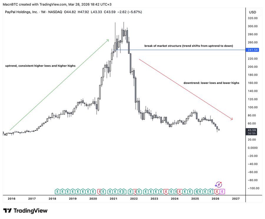 $PYPL on the monthly is a good example to demonstrate market structure. On the left we can see a clear uptrend. the chart is printing higher lows and higher highs, price is going up.