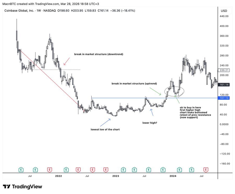 Letās look at $COIN on the weekly chart. First, on the left, we see a clear break in market structure with a support break, leading to a lower low and the start of a downtrend. Then the chart prints the lowest low. After that, we get a potential lower high, followed by a base forming. Eventually, price breaks above that lower high. That marks a break in market structure to the upside, forming the first higher high and confirming a new uptrend.