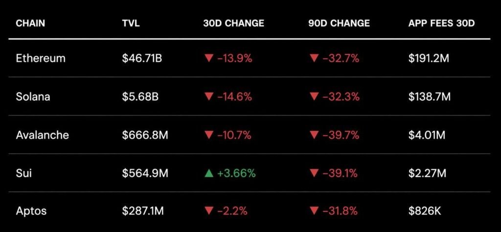 Sui’s 30-day chain fees are $178K. Its 30-day app fees are $2.27M, a 15x gap. This is structural: Sui deliberately prices gas cheaply (23.4% of all transactions are fully sponsored by dApps). The chain doesn’t extract rent from users. Applications do, and that’s where LPs and token holders capture value.