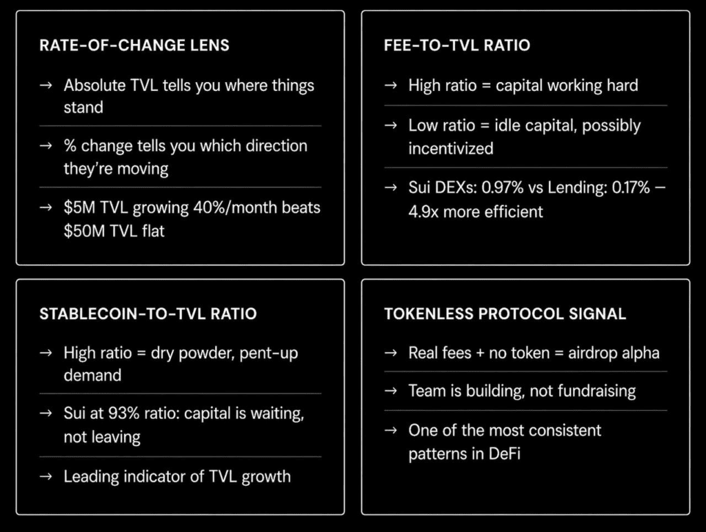 Good: “Is Sui’s DeFi ecosystem growing or contracting? What are the strongest signal protocols, and where is capital concentrating right now?”
