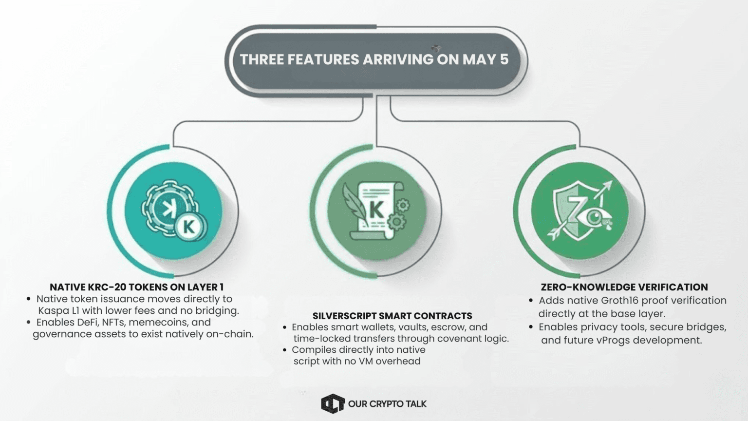 On May 5, 2026, Kaspa activates its biggest upgrade since the Crescendo hardfork, and it changes what the network can do. The Kaspa Covenants Hardfork, arriving in May 2026, introduces three major capabilities at once: native KRC-20 tokens on Layer 1, programmable transaction rules through covenants, and zero-knowledge verification built into the base layer. This is more than a routine network update. It marks Kaspa’s shift from a fast monetary network into a programmable Proof-of-Work blockchain capable of supporting native assets, smart wallet logic, and privacy-focused verification tools.