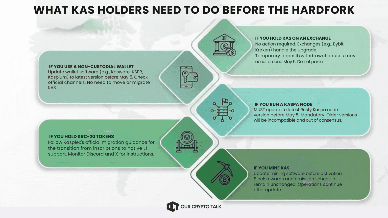 For most holders, the Kaspa Covenants Hardfork is straightforward. Your KAS stays on the same chain and at the same address. The key is knowing whether you need to update software or simply wait for service providers to handle it.