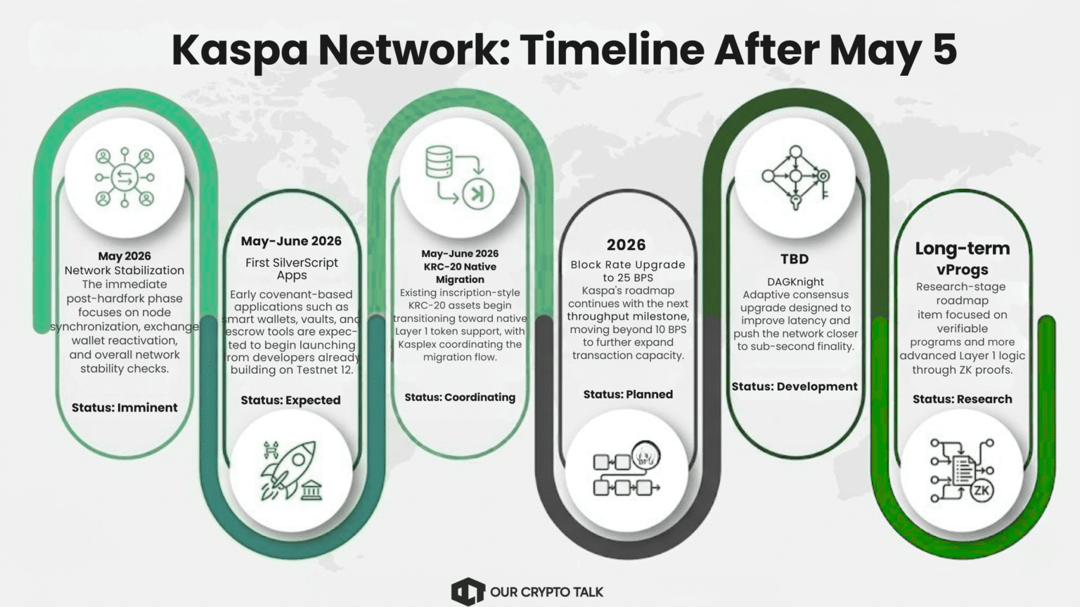 The roadmap after May 5 is where the Kaspa Covenants Hardfork moves from a protocol upgrade into an ecosystem test. The immediate priority in May 2026 is network stabilization. Node operators, miners, and exchanges will spend the first few days confirming successful synchronization, monitoring block production, and restoring normal deposit and withdrawal services. This phase is critical because early stability will shape market confidence around the upgrade.