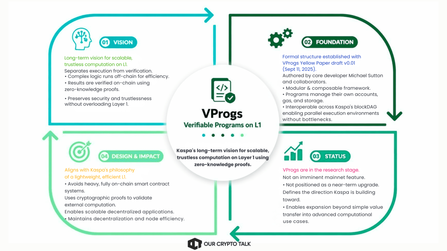 Importantly, VProgs are still in the research stage. They are not an imminent mainnet feature, and the roadmap does not position them as a near-term upgrade. Instead, they define the direction Kaspa is building toward as it expands beyond simple value transfer into more advanced computational use cases.