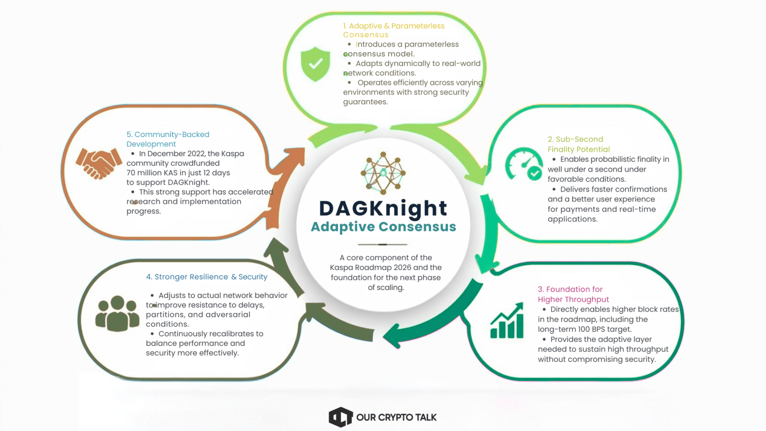 Importantly, DAGKnight is not an isolated upgrade. It directly enables the higher block rates outlined in the roadmap, including the long-term 100 BPS target. Without an adaptive consensus layer, sustaining such throughput would introduce higher risks. Therefore, DAGKnight acts as the foundation for Kaspa’s next phase of scaling.
