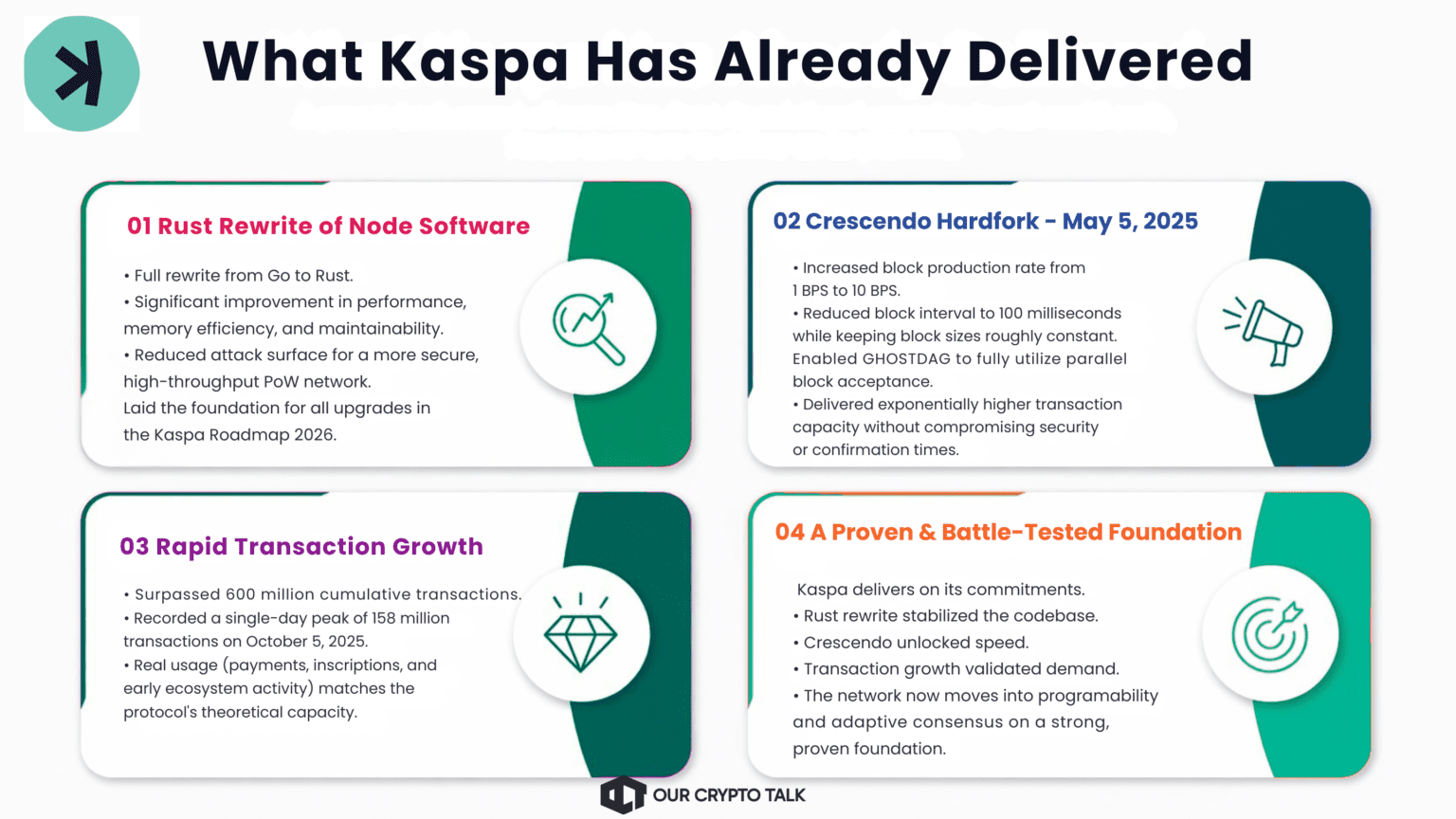 Taken together, these milestones highlight a clear pattern. Kaspa delivers on its commitments. The Rust rewrite stabilized the codebase, Crescendo unlocked speed, and transaction growth validated demand. Therefore, as the network moves into more complex areas such as programmability and adaptive consensus, it does so on a proven and battle-tested foundation.