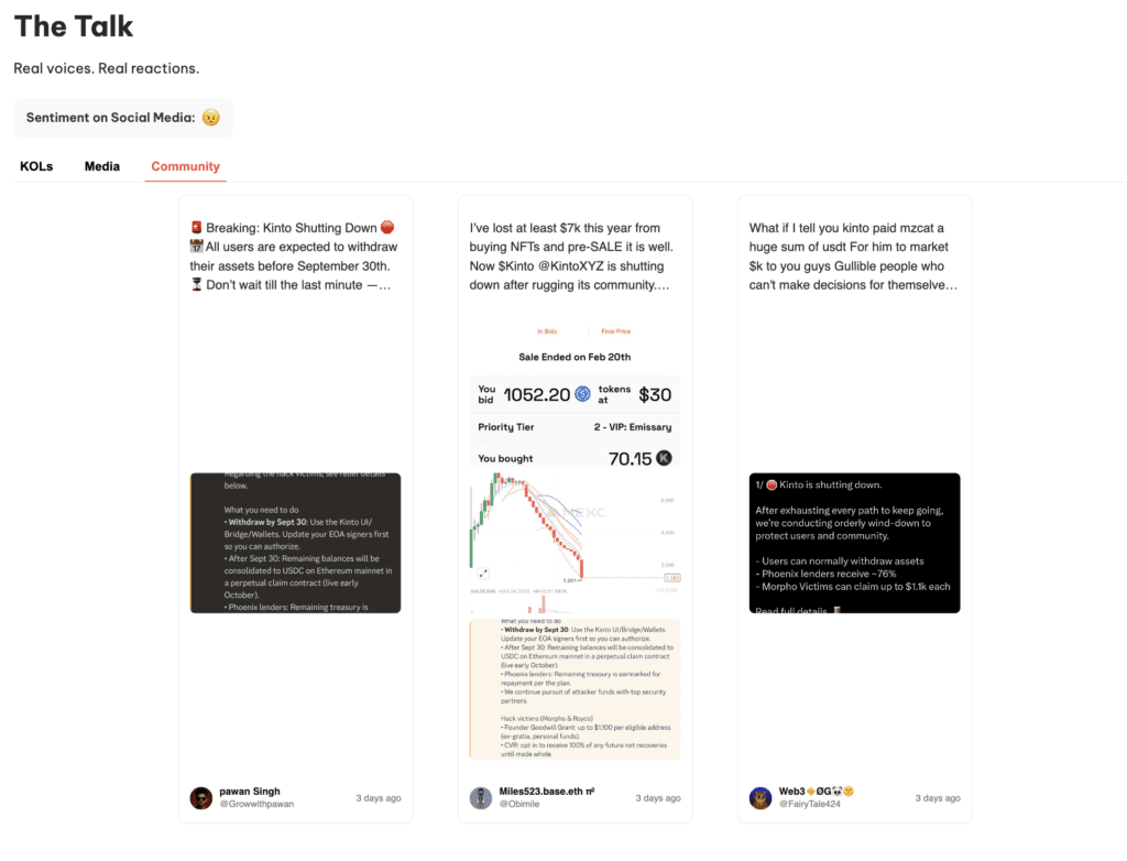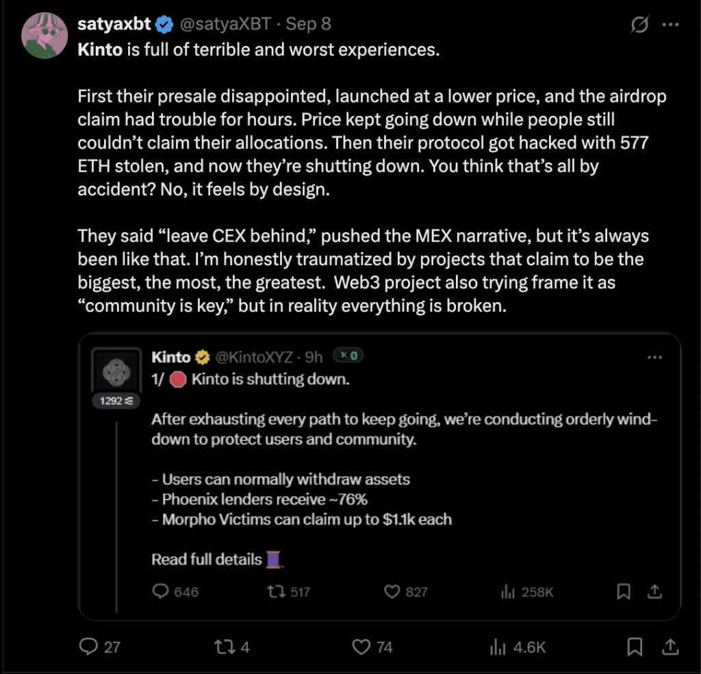 Panic set in. Token holders rushed to exit. Social media lit up with frustration and accusations. Some users even claimed Kinto had “rug-pulled” -launching, raising funds, and shutting down with insider profits.