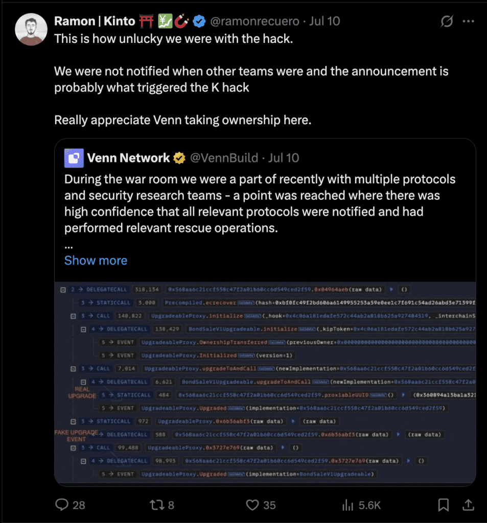 Security researchers had recently discovered this flaw, later named the “CPIMP” proxy exploit. It allowed attackers to insert a malicious proxy admin, effectively creating a hidden backdoor. Alarmingly, block explorers still showed everything as normal, masking the threat. This wasn’t unique to Kinto. The vulnerability posed a risk to thousands of contracts across the industry. Other teams, like Berachain, received timely warnings and patched the issue.