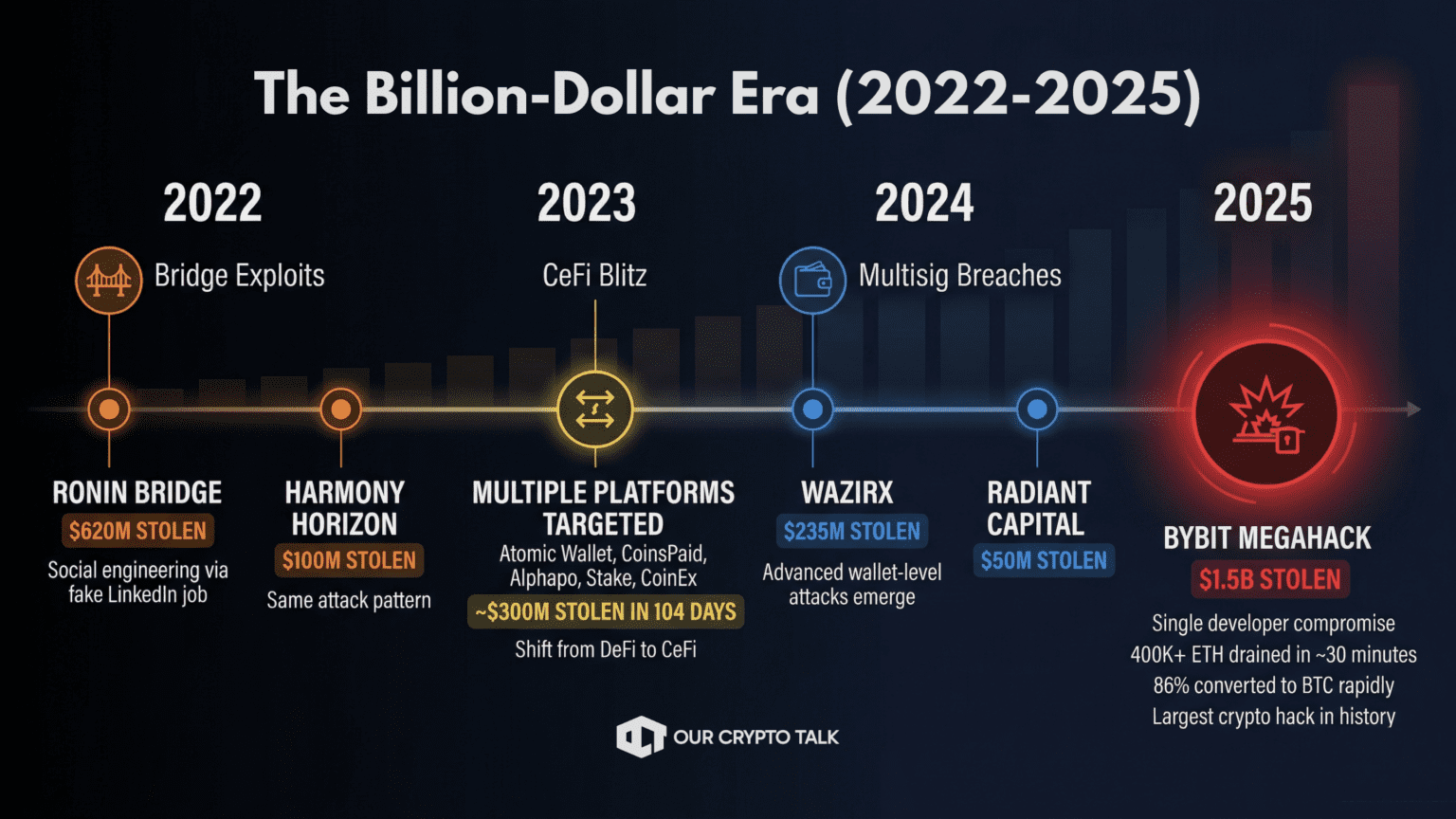 2023 – The CeFi Blitz. Lazarus shifted focus from decentralized protocols to centralized platforms. In a brutal three-month stretch: Atomic Wallet ($100 million), CoinsPaid ($37 million), Alphapo ($60 million), Stake.com ($41 million), and CoinEx ($54 million). The FBI confirmed North Korean attribution for each attack. Nearly $300 million in 104 days.