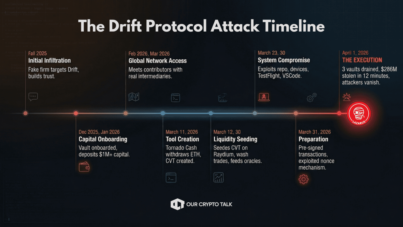 The Drift hack represents an uncomfortable evolution in the threat landscape. This was not a smart contract bug. It was not a flash loan exploit. It was a six-month intelligence operation conducted by a state actor that invested real capital, built real relationships, attended real conferences, and waited patiently until every piece was in position.
