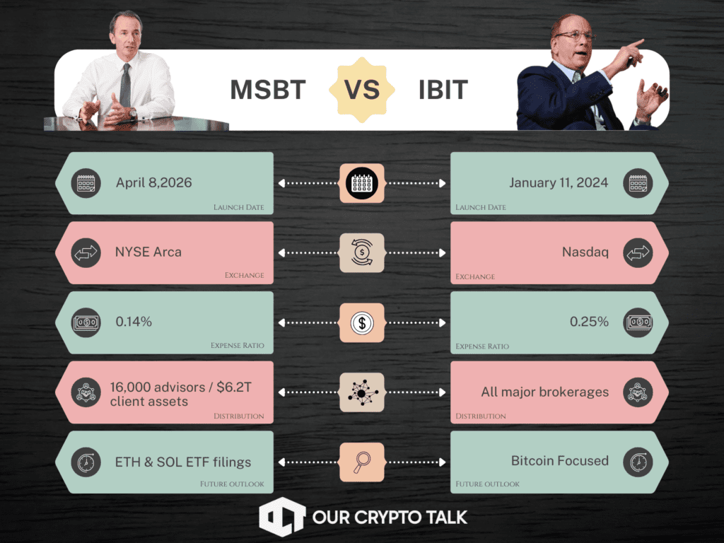 The comparison most investors want is MSBT against IBIT, BlackRock’s iShares Bitcoin Trust, which is the largest and most liquid spot Bitcoin ETF by a wide margin. Here’s how they stack up across the dimensions that actually matter.