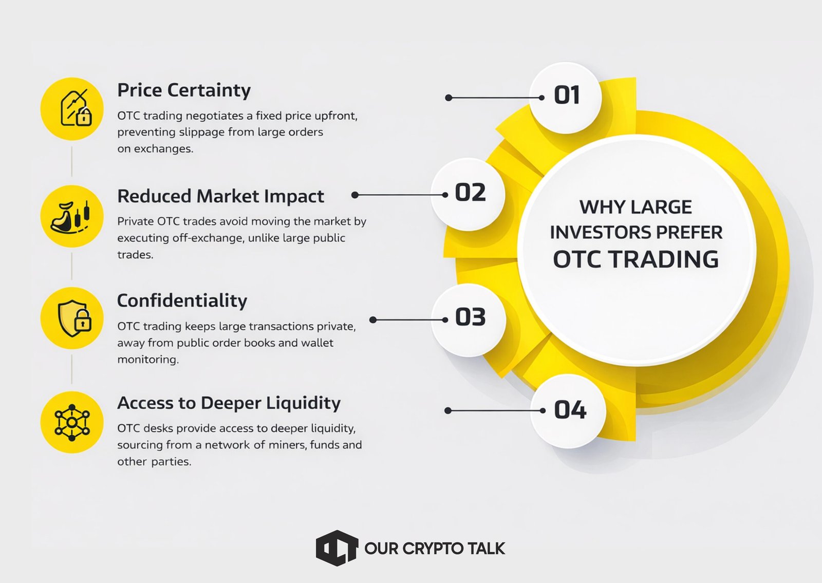 OTC trading exists in traditional financial markets as well. Forex, bonds, and commodities frequently trade over the counter. In crypto, the need for OTC execution is even stronger because liquidity on public exchanges can be fragmented. Large investors choose OTC desks for several reasons.