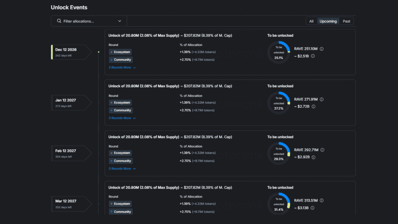 Total and maximum supply sits at 1 billion RAVE. Circulating supply at the time of the surge was roughly 248 million tokens, which represents only about 24-25% of total supply. The remaining ~76% is locked across team allocations, ecosystem funds, and vesting schedules with typical 12-36 month cliffs and linear unlock periods.