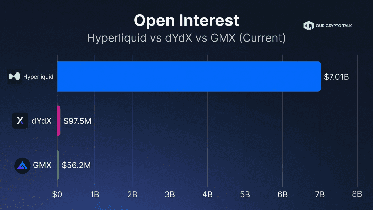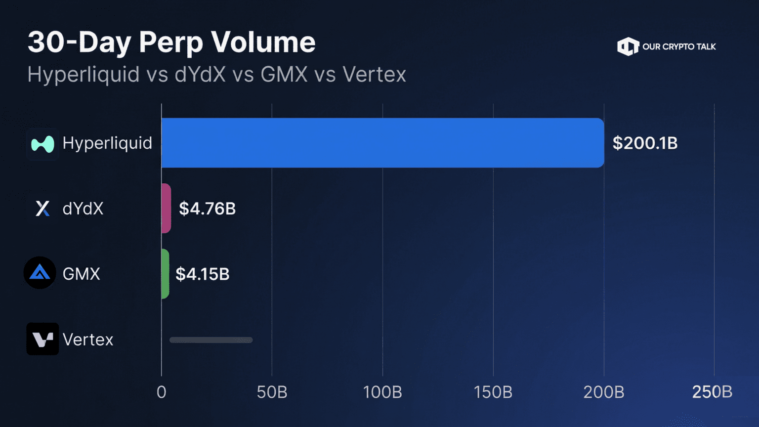 That is 42x more volume than dYdX and 48x more than GMX. The competitive gap is not a gap. It is a chasm.