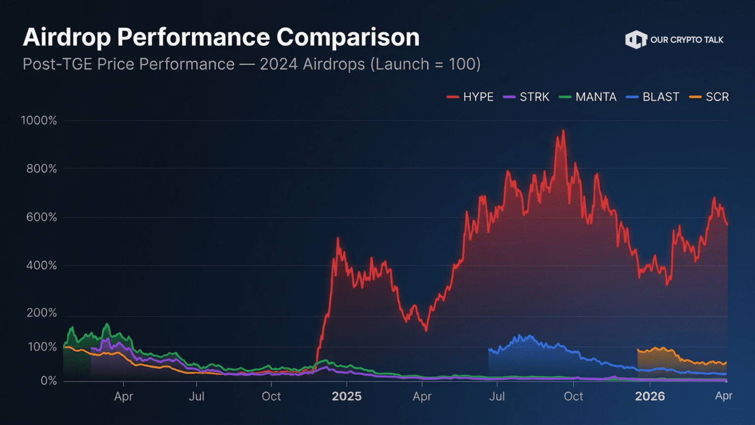 The standard playbook in 2024 said this should have been a disaster. Every major airdrop that year followed the same script: VCs take 20%+, community gets 5%, token launches, everyone dumps. Scroll, Blast, Starknet, and Manta all saw massive outflows post-TGE. The consensus on Crypto Twitter was that greedy VC allocations had killed the airdrop model entirely.