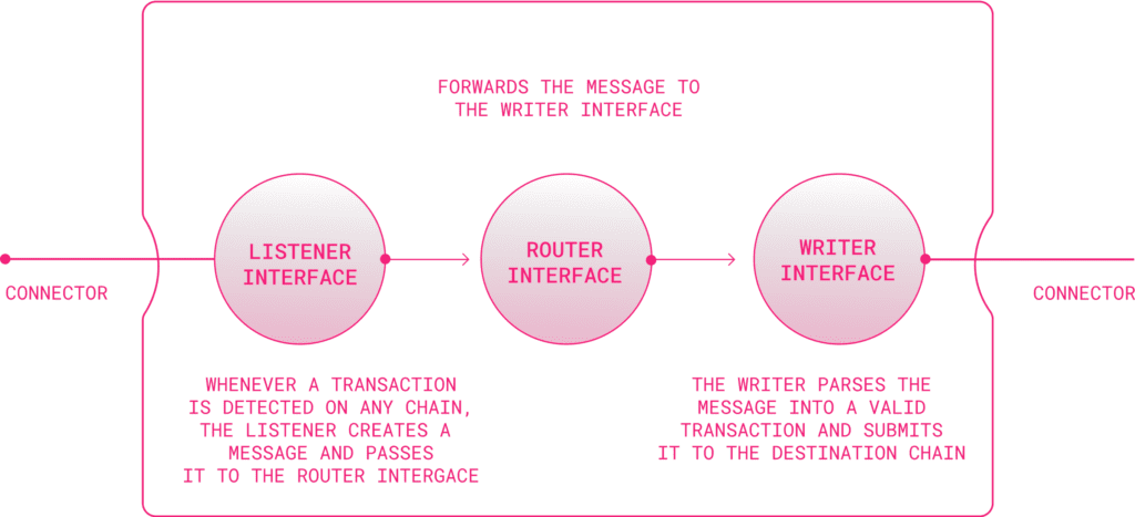 There is a listener that is subscribed to the source chains, whose job is to forward the transaction happening on any source chain to the writer. The writer then makes changes to the transaction to reformat it into a valid destination format transaction.