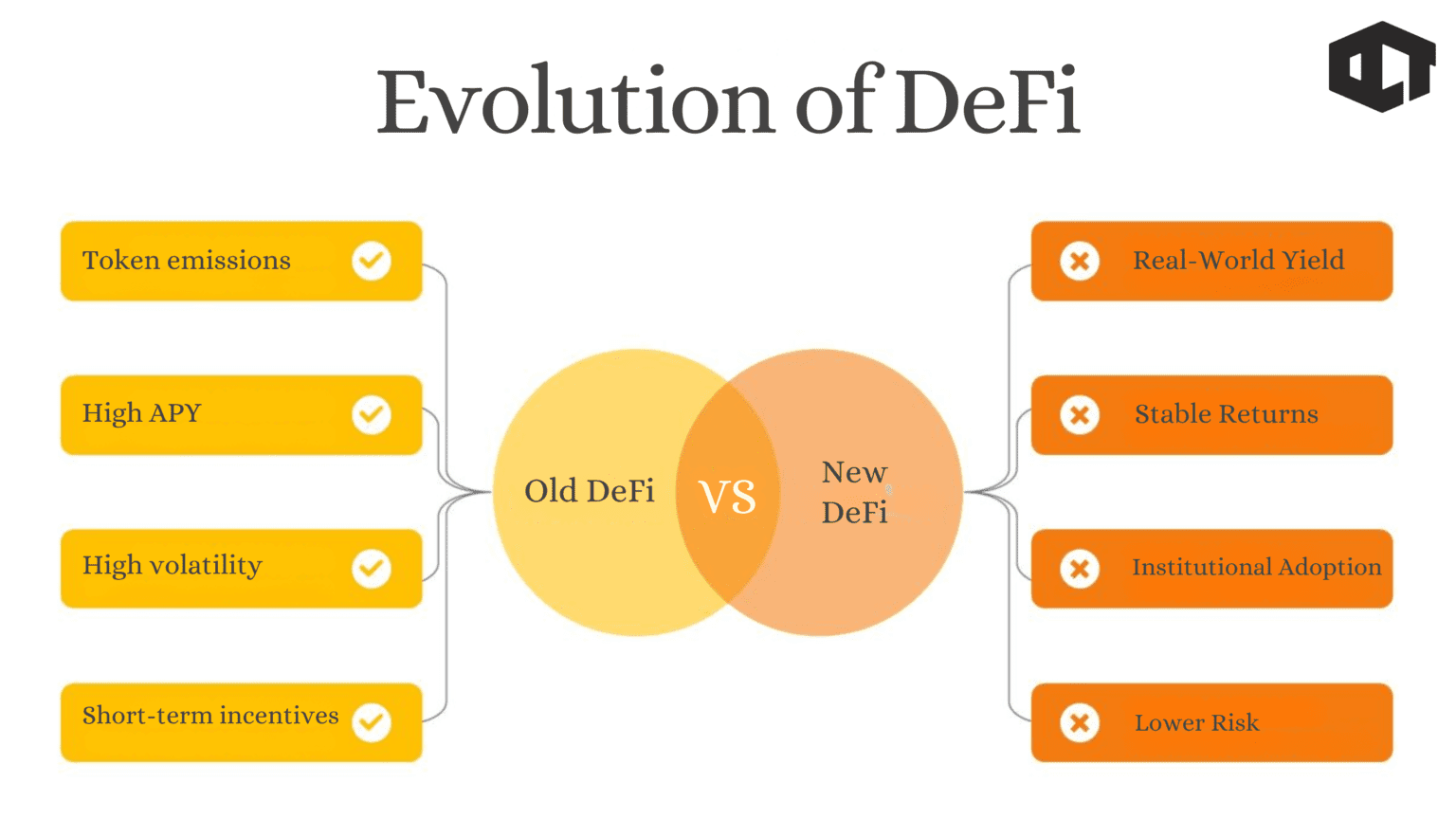 Old DeFi was driven by token emissions, high risk, and volatile returns. New DeFi is increasingly driven by real-world assets, institutional-grade backing, and more predictable yields. The underlying infrastructure hasn’t changed, the inputs powering it have.