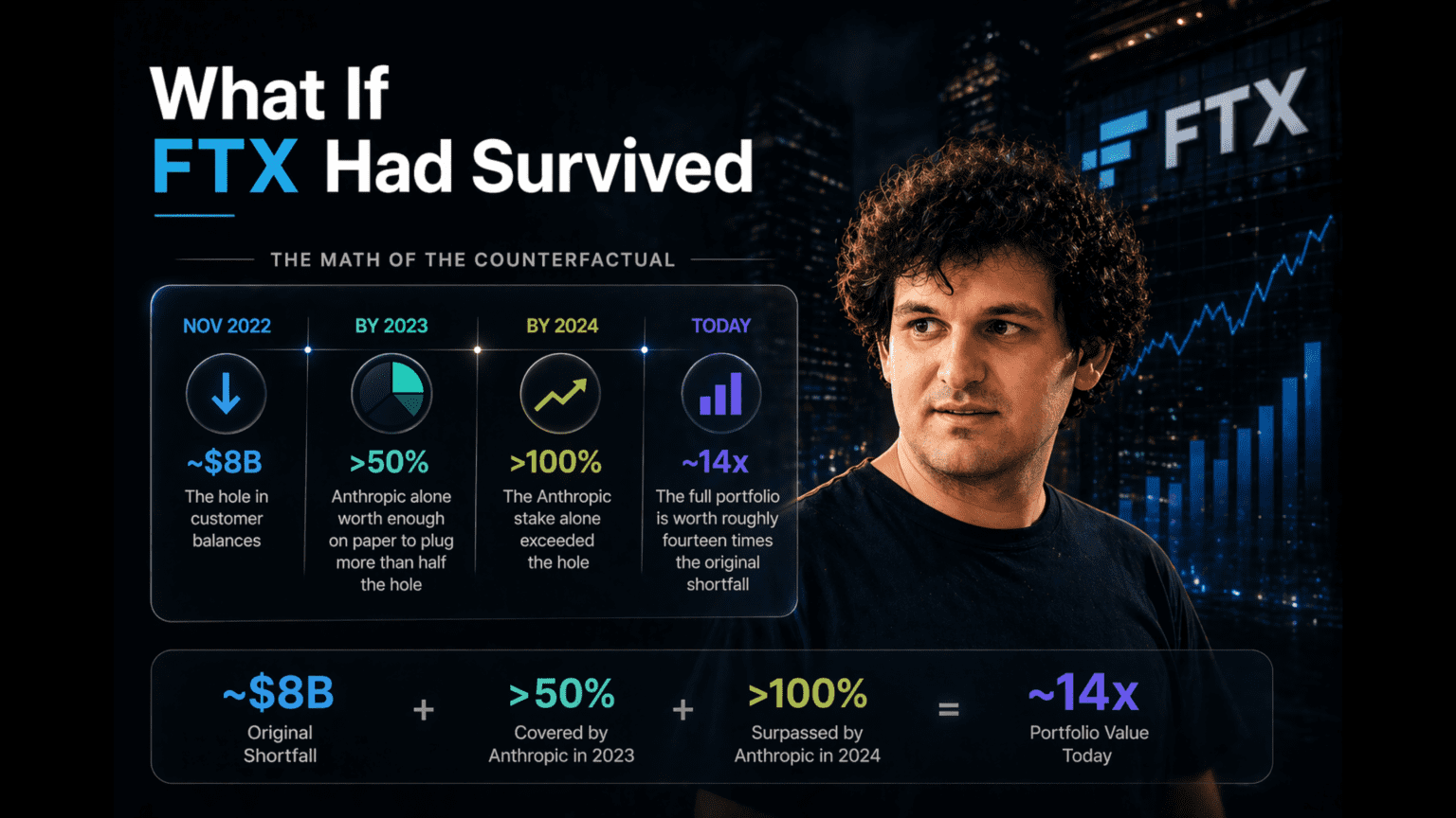 At fair value, the Sam Bankman-Fried investments were enough to fix the hole. Anthropic alone, by 2023, was worth enough on paper to plug more than half the hole. By 2024, the Anthropic stake alone exceeded the hole. By the time of this writing, the full portfolio is worth roughly fourteen times the original shortfall.