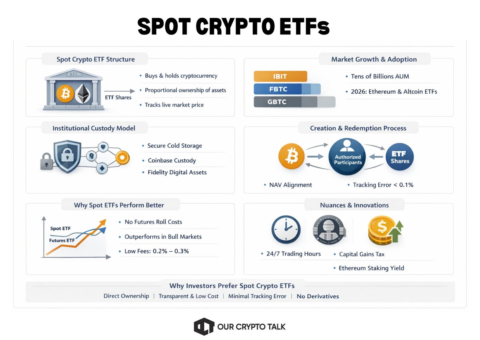 Overall, spot ETFs offer a clean, transparent, and increasingly favored method for investors seeking direct exposure to crypto assets without operational complexity.