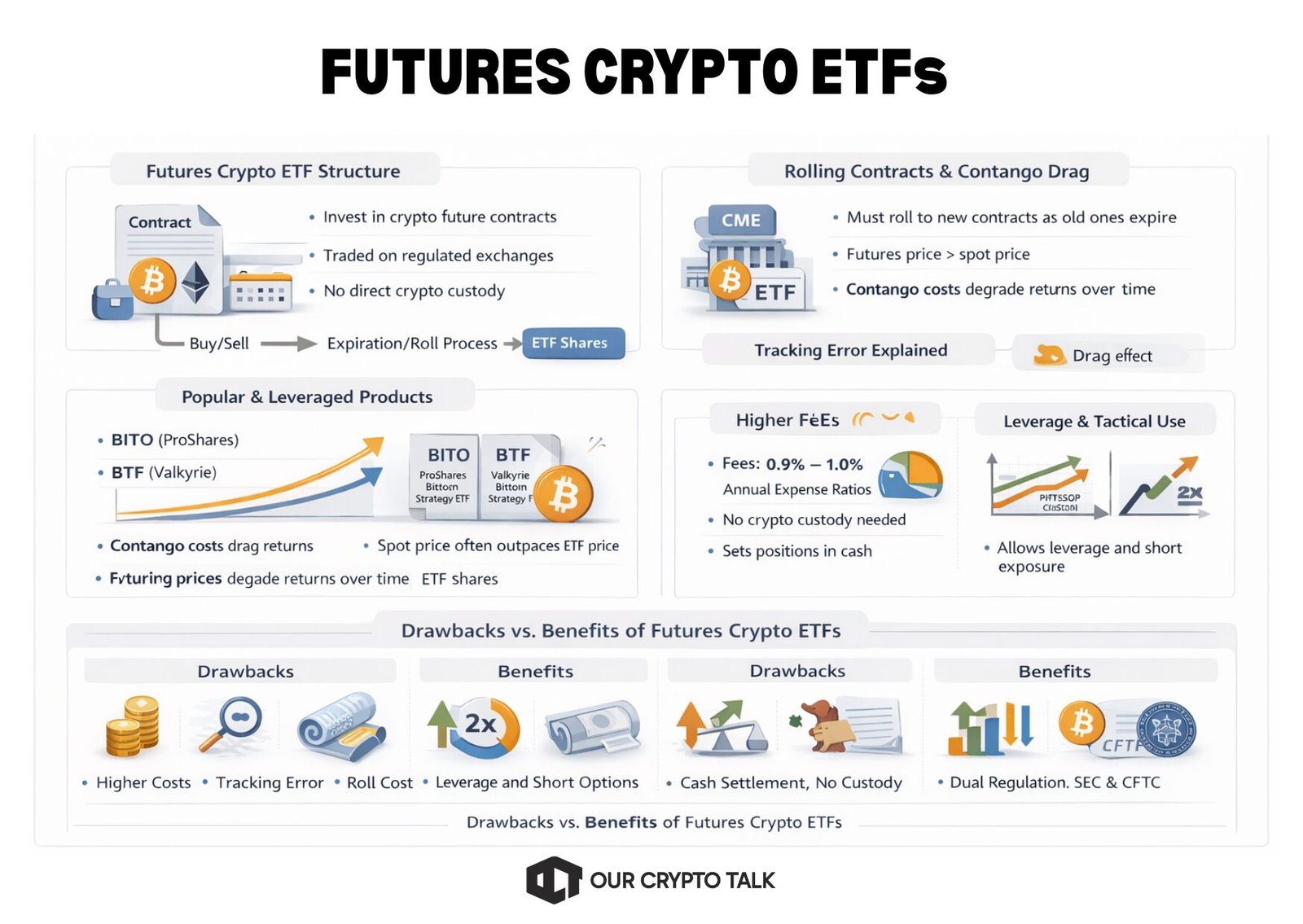 Risk profiles also diverge. Spot ETFs expose investors primarily to crypto price volatility and custody risks, which are mitigated through insured institutional storage. Futures ETFs introduce additional layers of risk, including contract pricing inefficiencies, leverage amplification, and counterparty exposure.