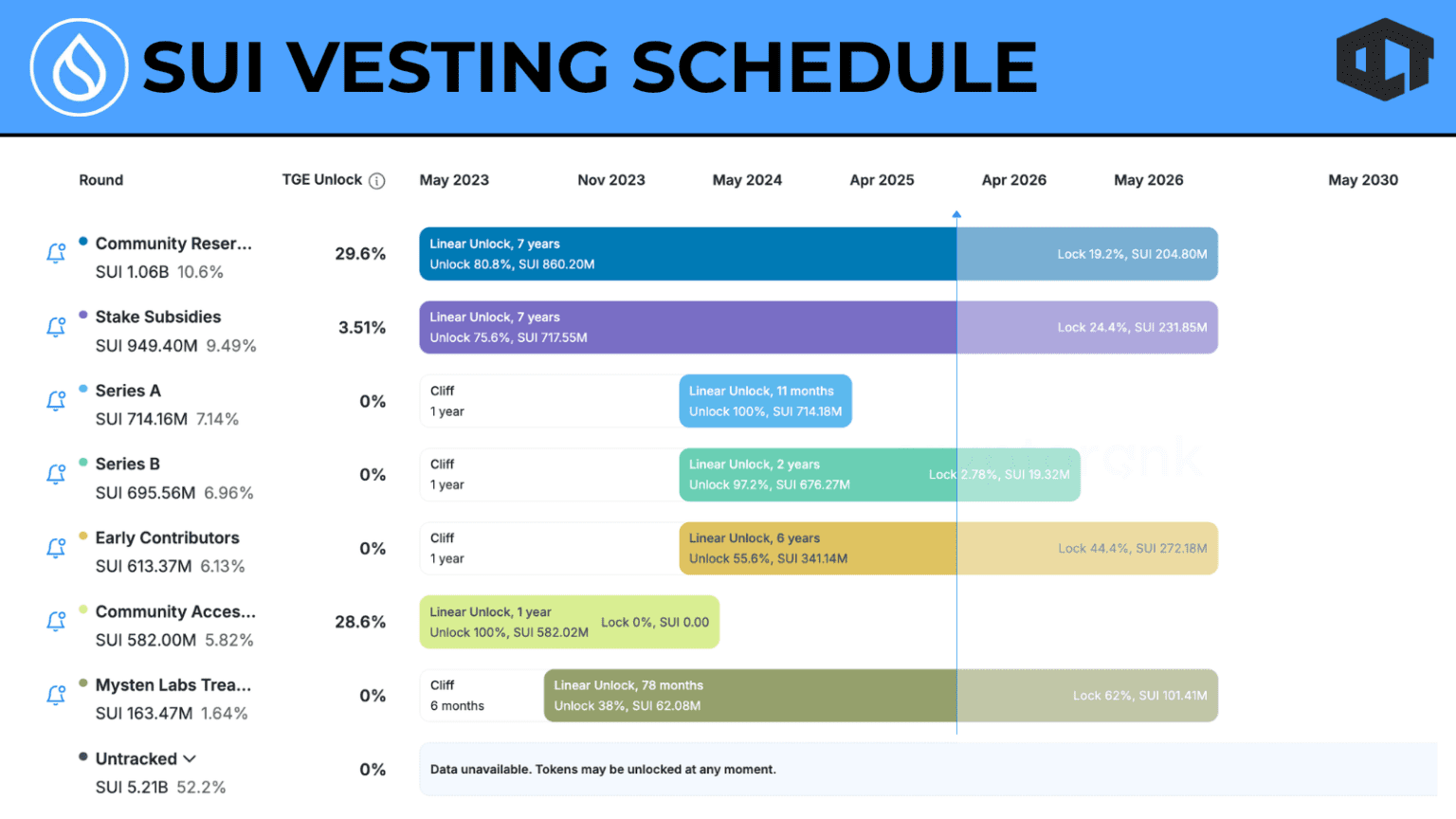 To return to its previous all-time high, SUI would need to rally over 500 percent. That alone is not unusual in crypto cycles. The problem lies in what happens to supply during that time. SUI currently has around 3.9 billion tokens in circulation. By the end of 2026, that number is expected to rise significantly. As supply increases, the required market cap for any given price also increases.