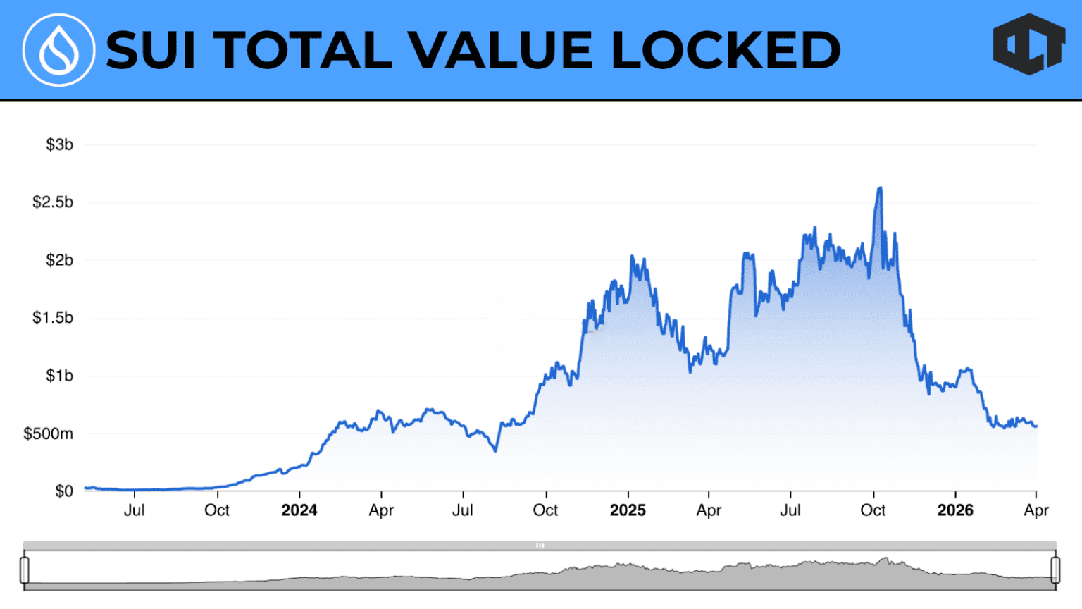 Supply alone does not determine price. Demand plays an equally important role. If demand grows faster than supply, price can still rise. However, SUI’s on-chain data suggests the opposite trend. Total Value Locked (TVL), a key metric for DeFi activity, peaked above $2.5 billion and later dropped significantly. While there has been some recovery, it remains far below previous highs.
