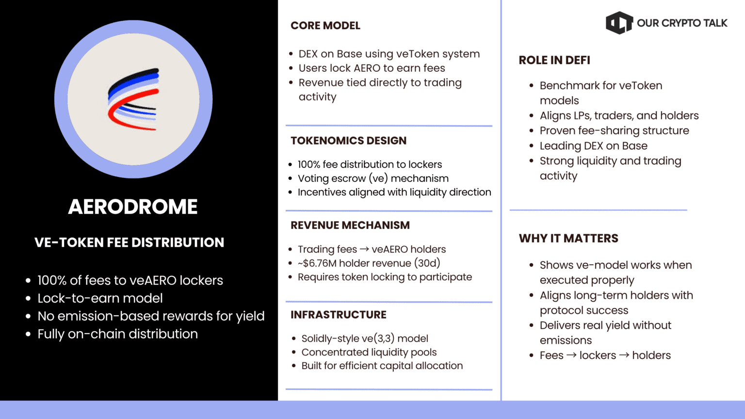 Aerodrome uses a veToken model on Base. Users lock tokens to receive a share of protocol fees. All revenue is distributed through this system. The design aligns incentives between liquidity providers and token holders.
