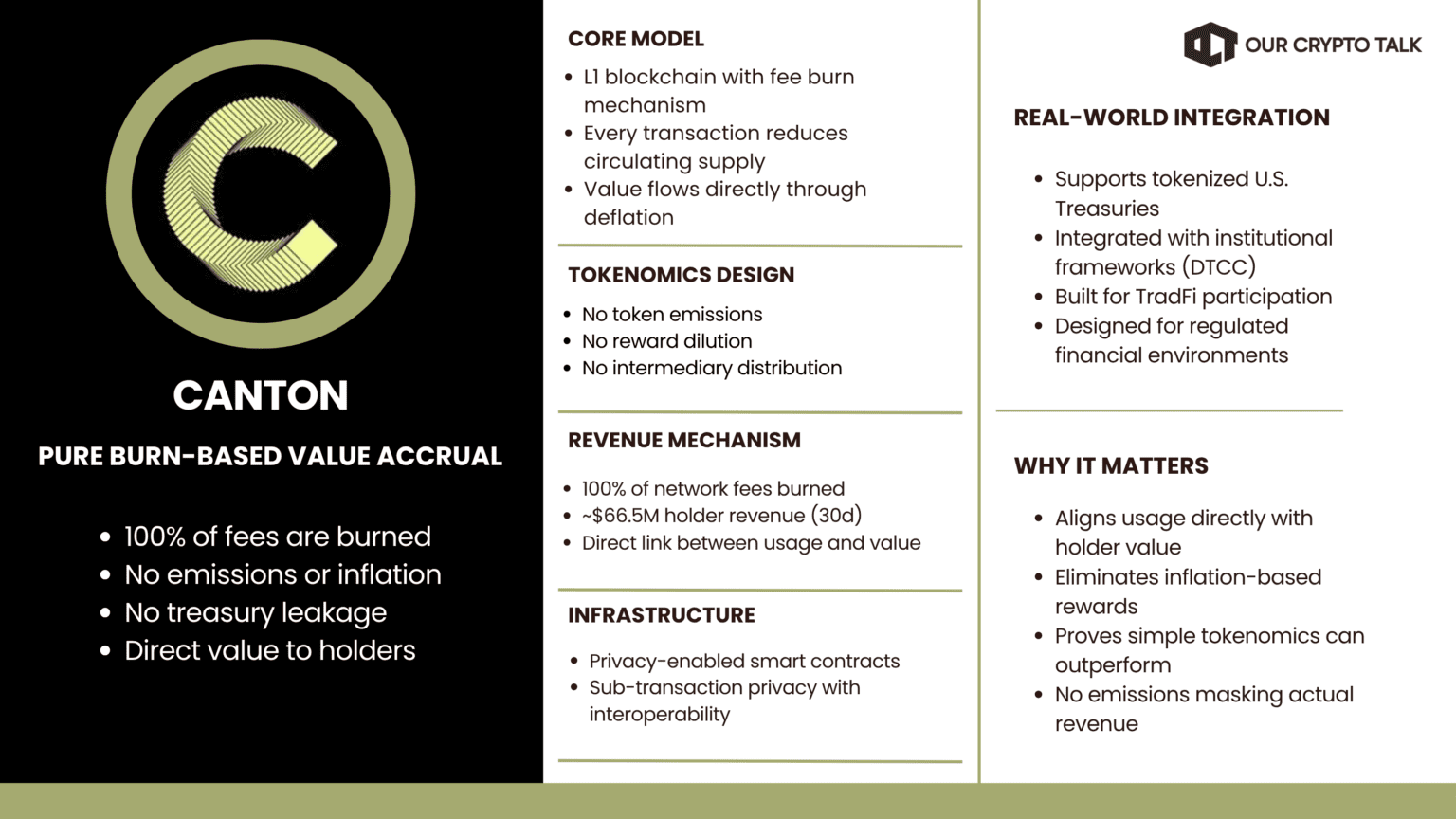 Canton operates as an L1 chain where every transaction fee is burned. This creates direct value for holders through supply reduction. There is no emission layer and no treasury leakage.