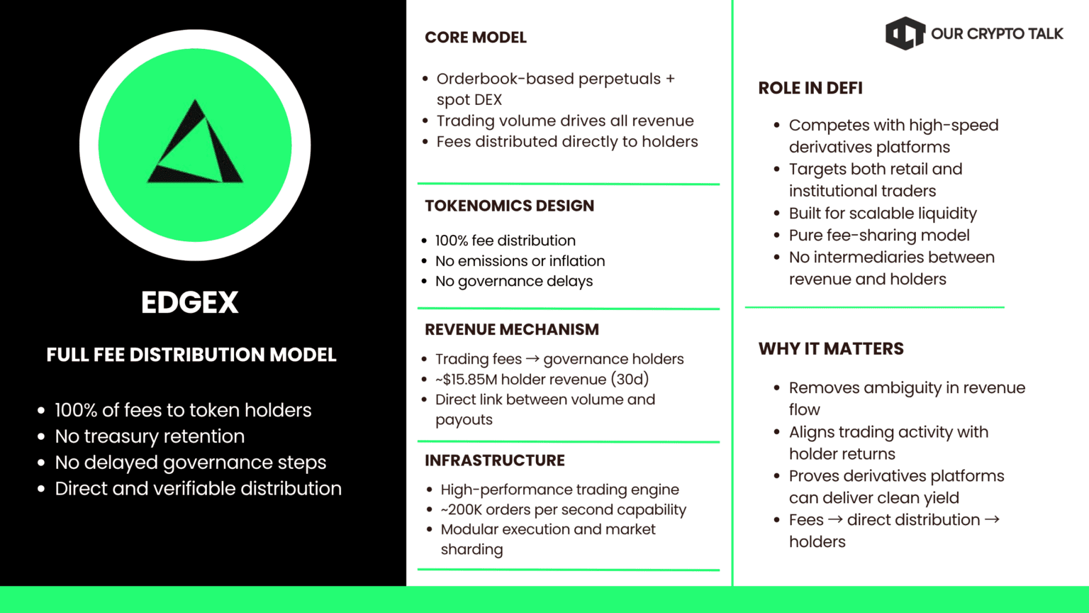edgeX is a derivatives platform that routes all trading fees to token holders. The model removes ambiguity. There is no treasury retention and no delayed governance step. Revenue distribution is direct and verifiable.