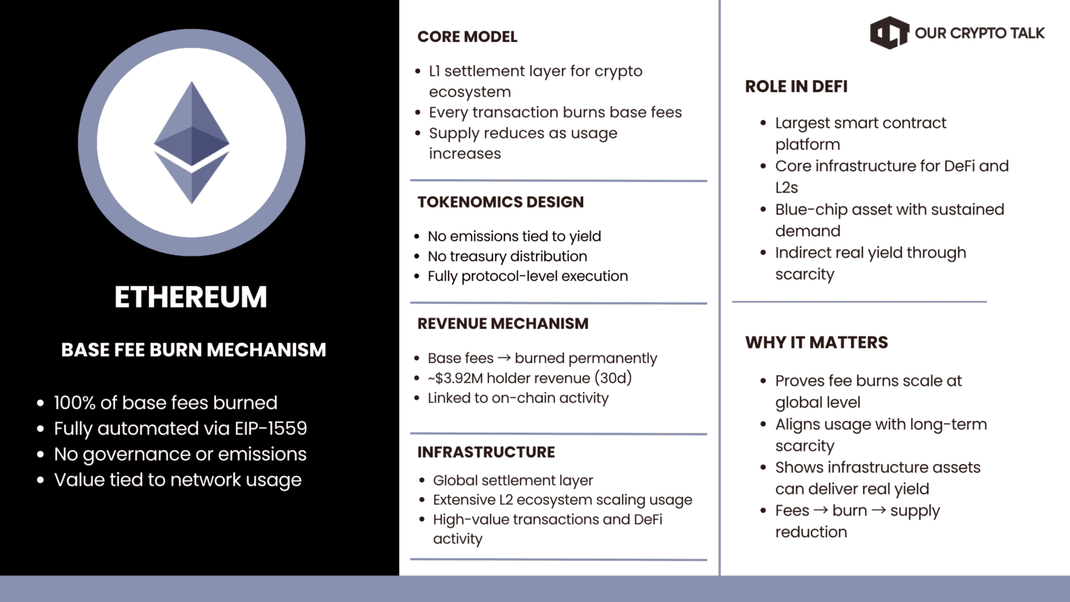 Ethereum burns base fees through its fee mechanism. Every transaction reduces supply. This creates indirect but real value for holders. The system is fully automated and does not rely on governance. The Real grade is clear.