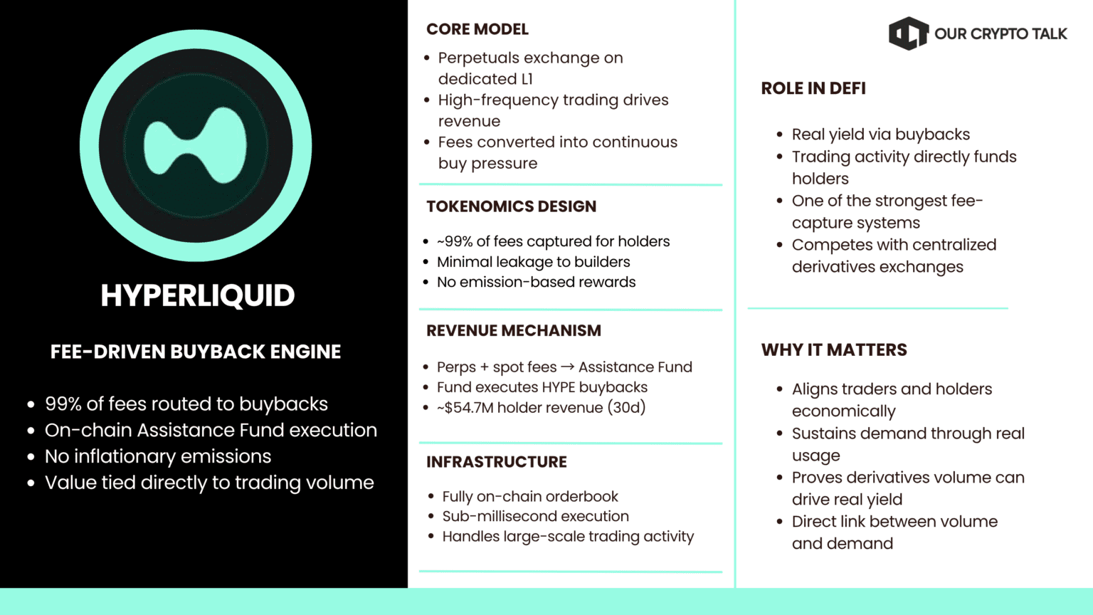 Hyperliquid runs a high-volume derivatives exchange. Almost all trading fees are routed into a buyback system through its Assistance Fund. The protocol consistently converts revenue into market demand for HYPE.